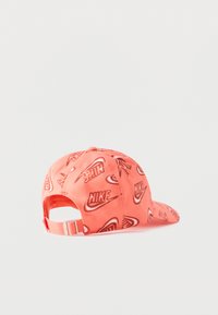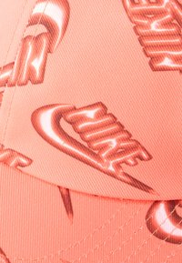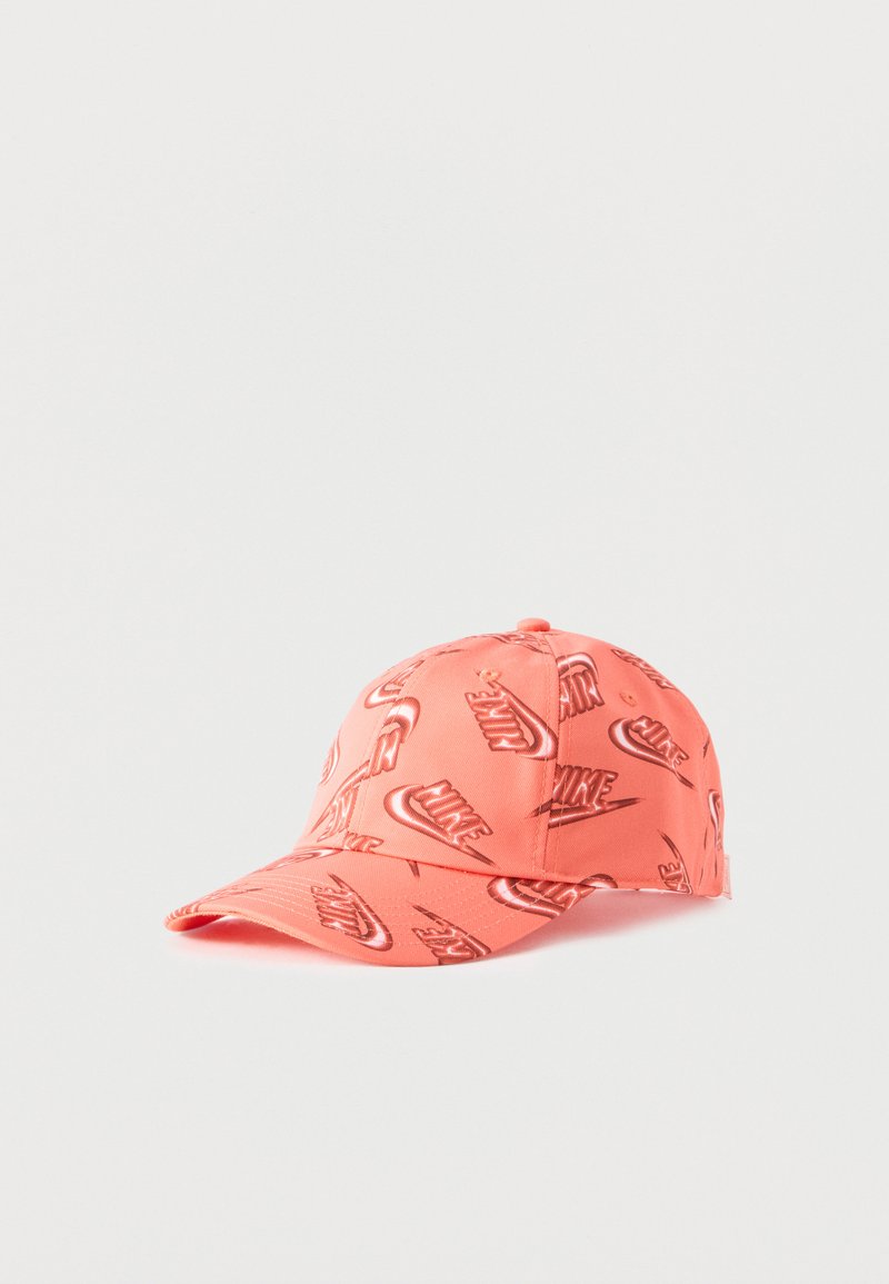 Koralska bejzbolska kapa s reljefnim ponavljajućim Nike logom i uzorcima swoosha, zakrivljenim obodom i gornjim gumbom.