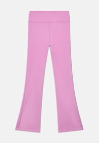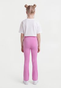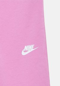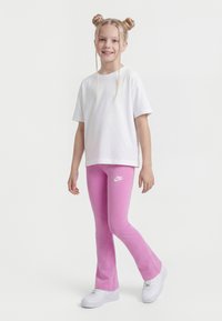 Nasmejana mlada djevojka s dvostrukim punđama i pletenicama, odjevena u bijelu majicu, ružičaste Nike helanke i bijele tenisice, stoji na bijeloj pozadini.