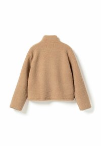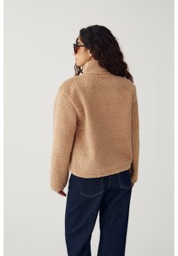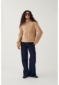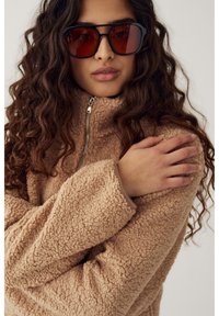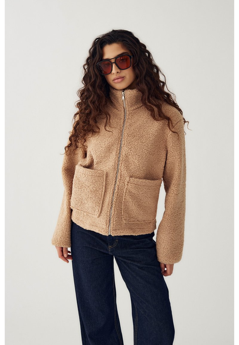 Žena s dugom kovrčavom kosom koja nosi prevelike smeđe sunčane naočale, bež flis jaknu na patentni zatvarač s velikim prednjim džepovima i tamnoplave traperice.