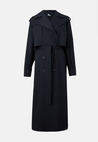 Crni kaput s dvostrukim kopčanjem i širokim reverima, preko crnog rolka majice i mini suknje, uparen s smeškim čizmama do kolena i sunčanim naočalama.