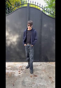 • Mornarska zip-up dukserica preko crne majice, u kombinaciji sa širokim tamnim trapericama i crnim čizmama. Jednostavan, ležeran dizajn koji naglašava udobnost.