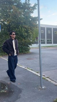 Smeđa kožna jakna, zeleni prugasti pulover i crne široke hlače. Solarne naočale i pozadina od crvene opeke naglašavaju urbani stil.