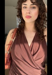 • Smeđi, bezrukavni top s drapiranim dizajnom i glatkom teksturom. Model drži smeđu torbu na ramenu, s kovrčavom frizurom i minimalnim nakitom.
