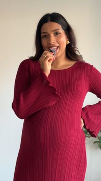 Duga, rebrasta haljina boje burgundca s raširenim rukavima i naboranim rubom. Nošena s smeđim čizmama do koljena. Smeđa torba naslonjena na rame.