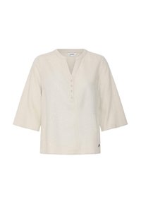 Mlada žena s dugom smeđom kosom koja nosi bijelu bluzu s gumbima i 3/4 rukavima te lepršave ružičaste kratke hlače na jednobojnoj pozadini.