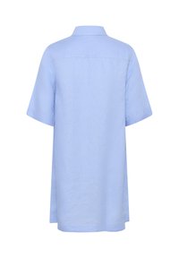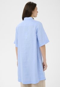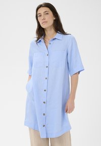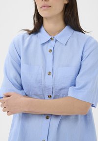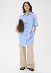 Žena u svijetloplavoj haljini-košulji s kratkim rukavima i džepovima na prsima, te bež hlačama, stoji s jednom rukom u džepu.