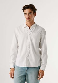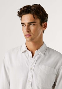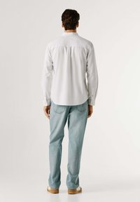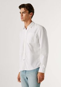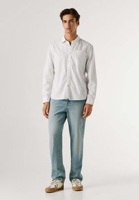 Bijela košulja dugih rukava od laganog materijala, s džepom na prsima i zaobljenim donjim rubom. Uparen s svijetlim trapericama.