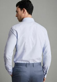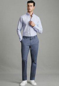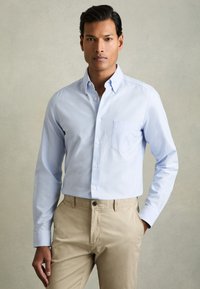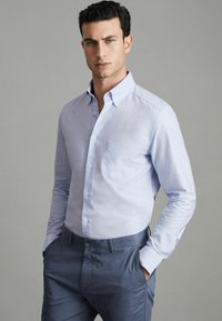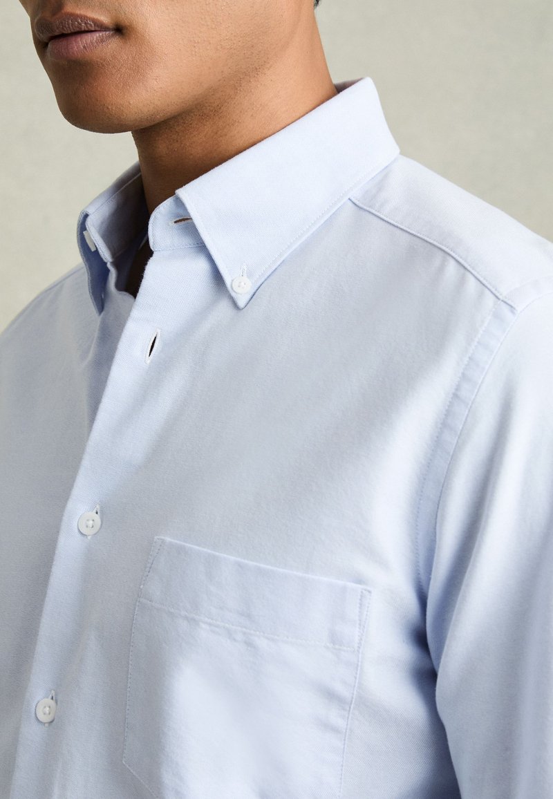Približna snimka osobe koja nosi svijetloplavu košulju s gumbima, zakopčanim ovratnikom i džepom na prsima, na neutralnoj pozadini.