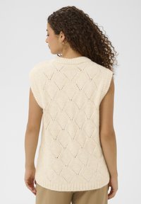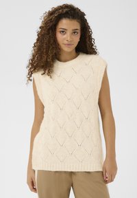 Žena s kovrčavom kosom koja nosi bezrukavu kremastu pletenu vestu s dijamantnim uzorkom i smeđe hlače, na jednobojnoj pozadini.