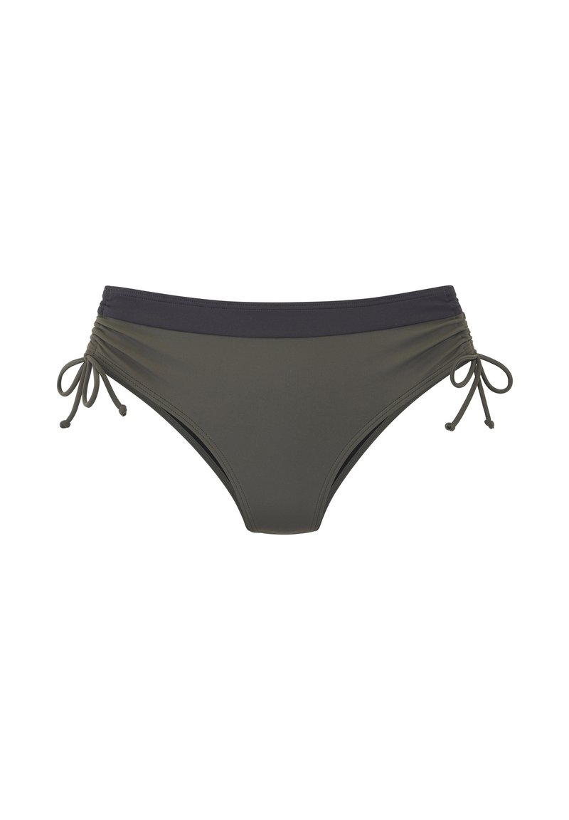 Donji dio bikinija maslinasto zelene boje s crnim pojasom i podesivim vezicama sa strane na bijeloj pozadini.