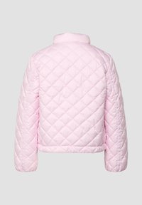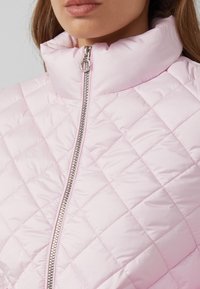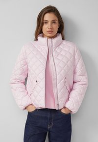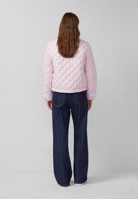 Žena u svijetlo ružičastoj prošivenoj jakni preko odgovarajućeg džempera, s rukama u džepovima i tamnoplavim trapericama, stoji na sivoj pozadini.