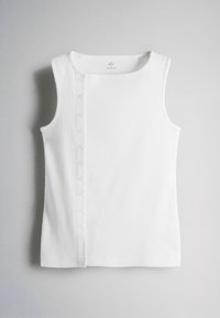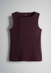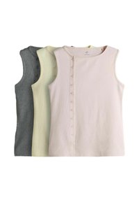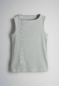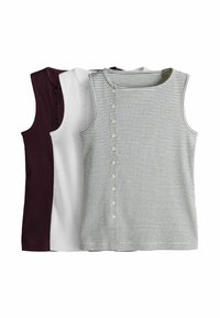 Tri bezrukavne rebraste majice u boji burgundca, bijeloj i bijeloj s crnim prugama, svaka s gumbima uz bočni ili prednji izrez ovratnika.