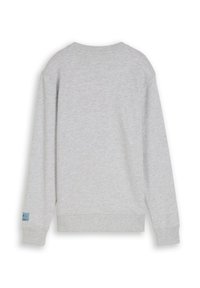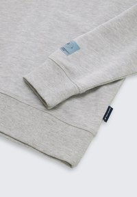 Svijetlosiva majica dugih rukava s okruglim izrezom, rebrastim manšetama, rubom, ovratnikom i malom plavom oznakom na lijevom rukavu.