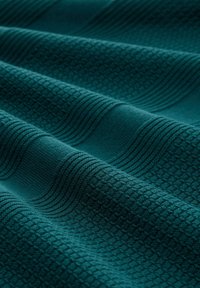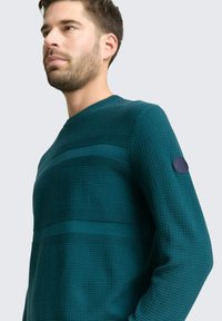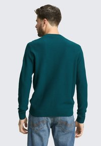 Muškarac s bradom u teksturiranom tirkiznom džemperu ravnog kroja i plavim trapericama, stoji s jednom rukom u džepu na jednobojnoj pozadini.