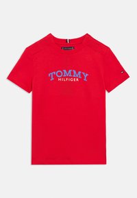 Plava pamučna majica kratkih rukava s bijelim i crvenim logotipom "TOMMY HILFIGER" te dizajnom okruglog ovratnika.