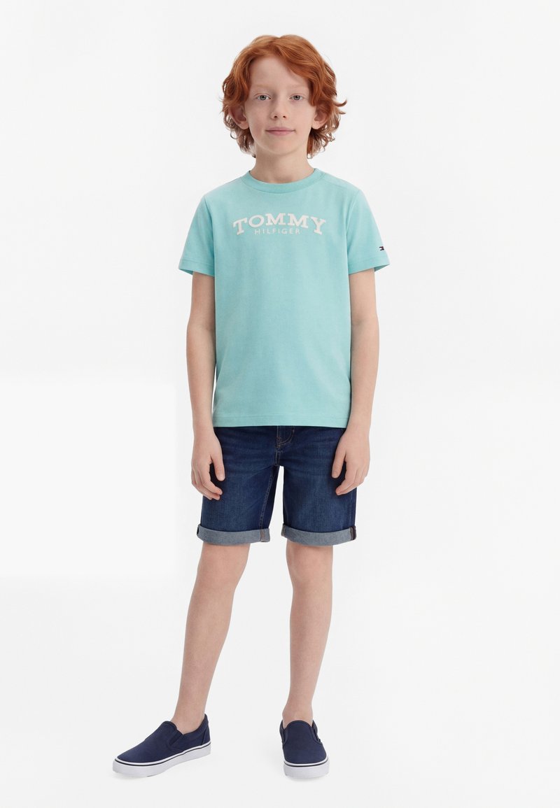 Crvenokosi dječak stoji, nosi svijetloplavu Tommy Hilfiger majicu, tamne prošivene traper kratke hlače i mornarskoplave tenisice bez vezica.