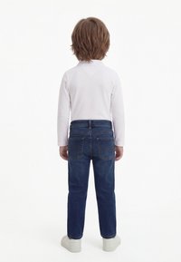 Osmijeh mladi dječak svijetlosmeđe kose, odjeven u bijeli polo s dugim rukavima, tamnoplave traperice i bijele tenisice, stoji na bijeloj pozadini.