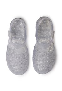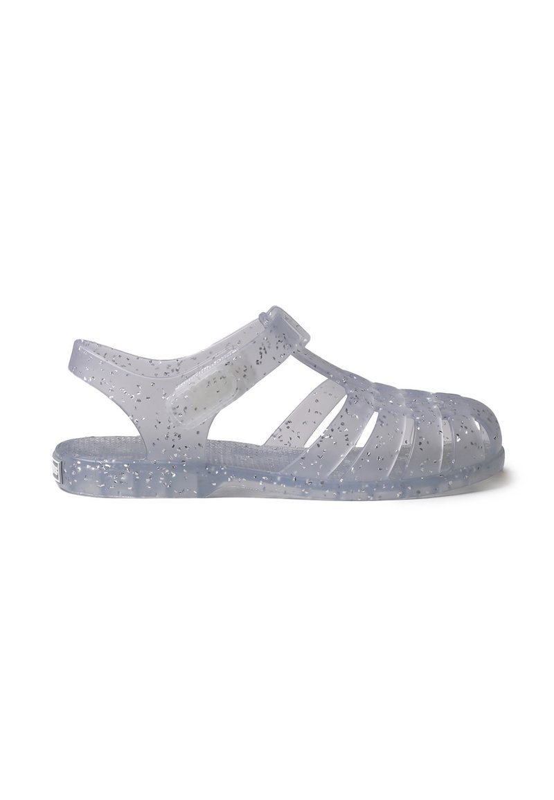 Prozirni sandale od želea sa zatvorenim vrhom, višestrukim remenčićima i podesivim remenom oko gležnja na bijeloj pozadini.