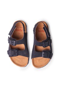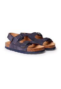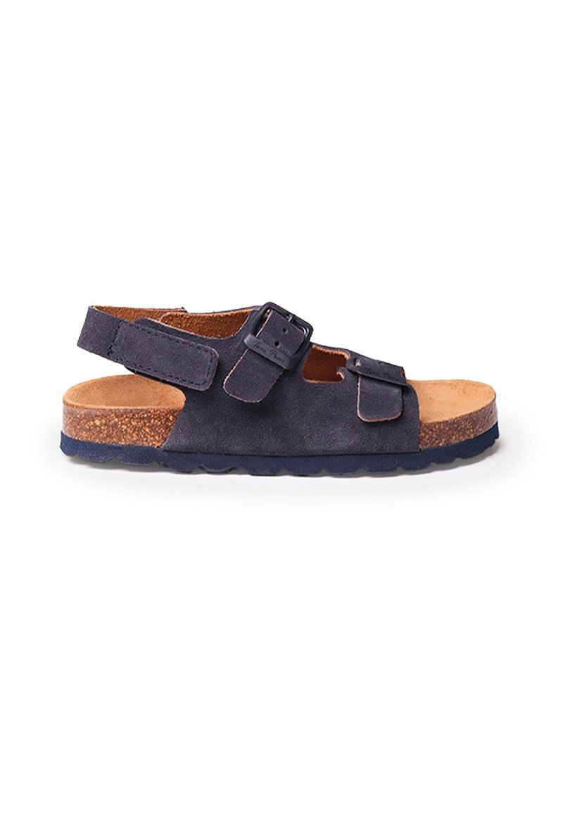 Navy plave sandale od brušene kože s pluto uloškom, dvije podesive remenčiće s kopčama i stražnji remen s Velcro zatvaračem.