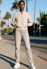 Bež bomber jakna od glatkog, laganog tkanja; rebrasti rukavi i rub; prednji patentni zatvarač i bočni džepovi; prianjajuća silueta.