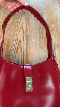 Crvena kožna torba za rame s zakrivljenim oblikom i zatvaračem u zlatnoj boji na bijeloj pozadini.