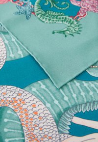 Tirkizna svila marama s složenim morskim motivima, uključujući sirene, školjke i koralje, okružena dekorativnom ivicom.