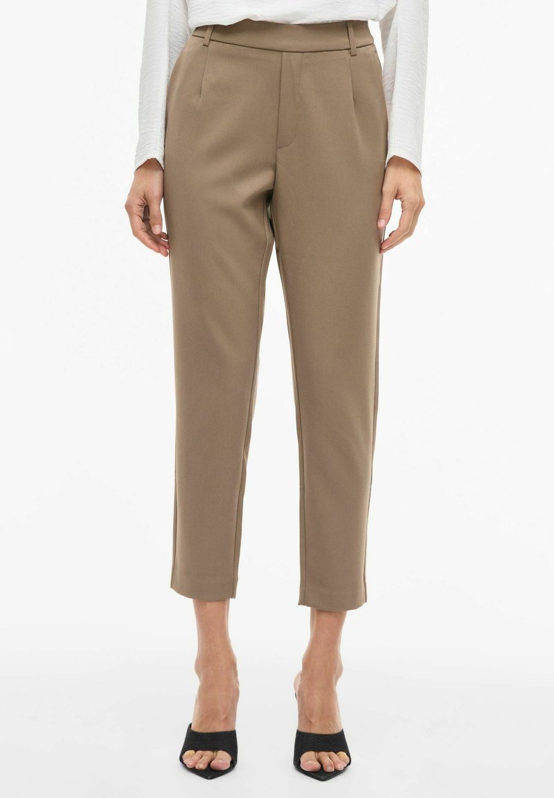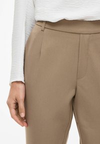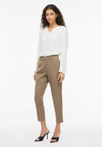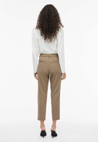 Smeđe krojene hlače s visokim strukom, ravnim krojem i nabranim prednjim dijelom. Tkanina ima glatku teksturu. Stilizirano s crnim sandalama otvorenih prstiju.