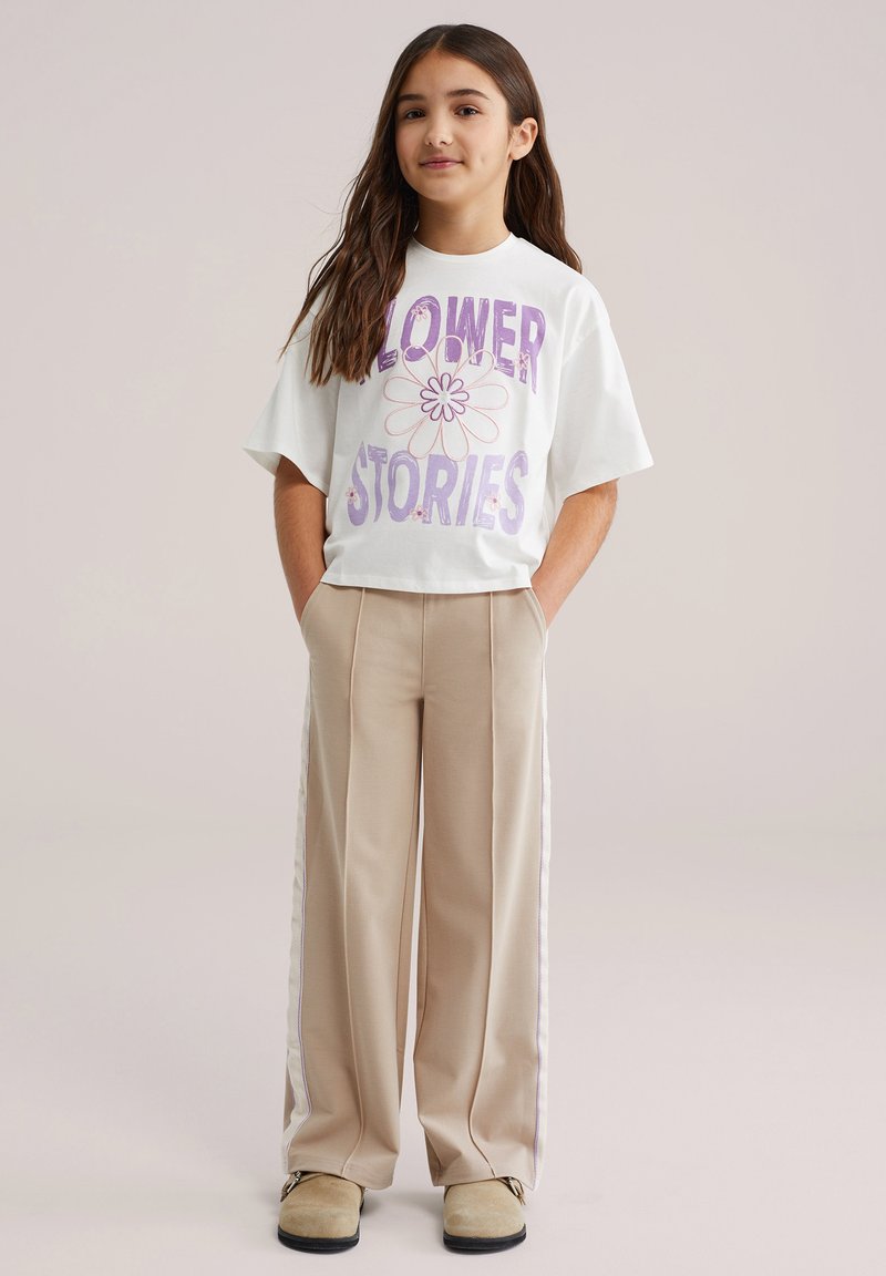 Bijela majica s ljubičastim grafičkim tekstom "FLOWER STORIES", uparena s bež hlačama širokih nogavica s bočnim prugama i cipelama za skliznuće.