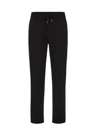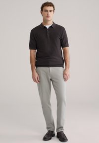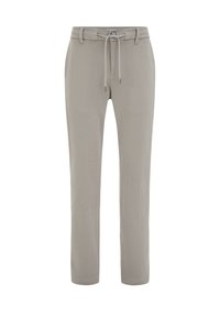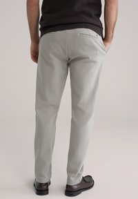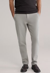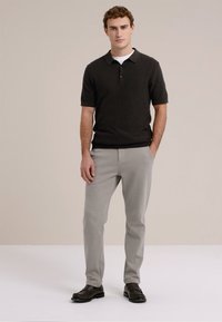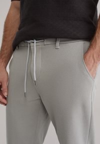 Svjetlosive hlače uskog kroja, napravljene od mekog tkanja glatke teksture, s prednjim džepovima, nošene s tamnocrnim mokasinama.