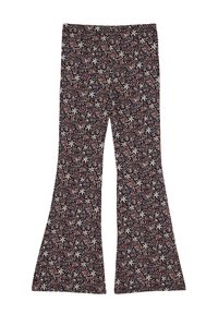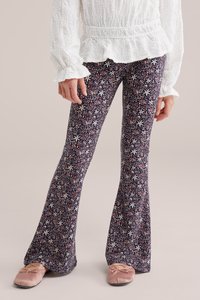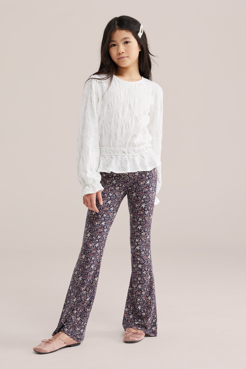 Djevojka s dugom tamnom kosom i ukosnicom od bisera, obučena u bijelu teksturiranu bluzu dugih rukava i hlače širokih nogavica s cvjetnim uzorkom te ružičaste cipele.
