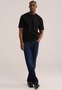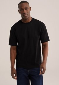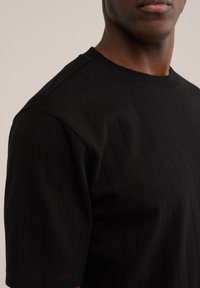 Muškarac u crnoj rebrastoj majici kratkih rukava i tamnoplavim trapericama, stoji na jednostavnoj svijetloj pozadini.